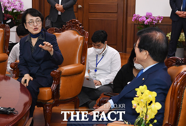 [더팩트ㅣ국회=배정한 기자] 김진애 열린민주당 원내대표(왼쪽)가 9일 오전 서울 여의도 국회에서 국회의장실을 예방해 박병석 국회의장과 대화를 하고 있다. hany@tf.co.kr 사진영상기획부 photo@tf.co.kr