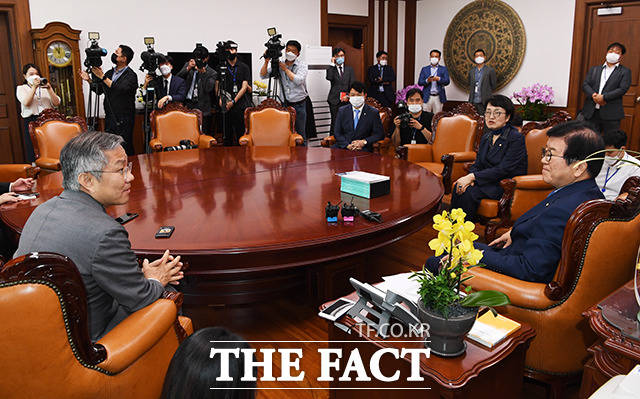 [더팩트ㅣ국회=배정한 기자] 박병석 국회의장(가운데)이 9일 오전 서울 여의도 국회에서 국회의장실을 예방한 최강욱 열린민주당 대표, 김진애 원내대표(왼쪽)와 기념사진 촬영을 하고 있다.