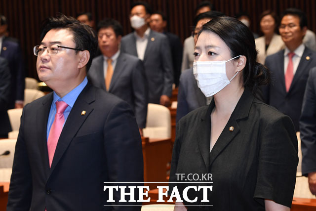 [더팩트 | 국회=남윤호 기자] 미래통합당 김성원 원내수석부대표(왼쪽)와 배현진 원내대변인이 12일 오전 서울 여의도 국회에서 열린 의원총회에 참석해 애국가를 제창하고 있다.