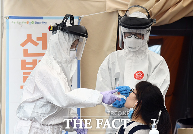 [더팩트ㅣ이동률 기자] 더운 날씨가 계속 이어지고 있는 12일 오후 서울 양천구의 한 선별진료소에서 의료진이 검체를 채취하고 있다.