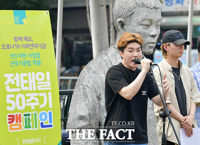 [더팩트ㅣ이덕인 기자] 6차 전태일 50주기 추모 캠페인이 17일 오후 서울 종로구 전태일다리에서 열린 가운데 래퍼 신진(왼쪽)이 전태일을 추모하는 공연을 펼치고 있다.