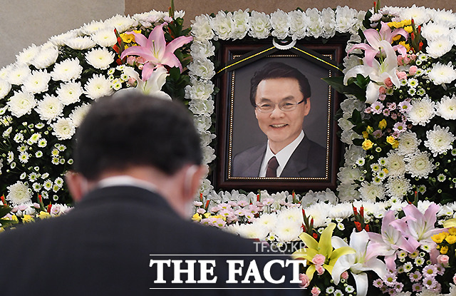 [더팩트ㅣ이새롬 기자] 18일 서울 종로구 연건동 서울대병원 장례식장에 마련된 홍사덕 전 국회부의장의 빈소에 고인의 영정이 놓여 있다.