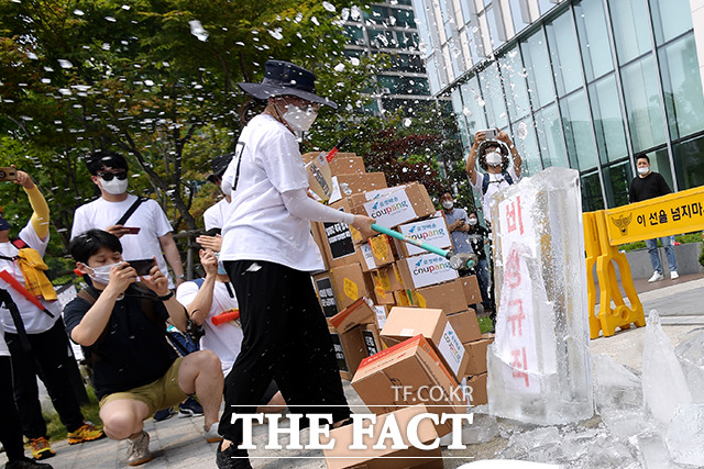 [더팩트|이선화 기자] 20일 오후 서울 송파구 잠실 쿠팡 본사 앞에서 열린 '죽음과 해고를 멈추는 40리 걷기'에서 코로나19 비정규직 긴급행동 관계자 및 참가자들이 얼음 깨기 퍼포먼스를 하고 있다.