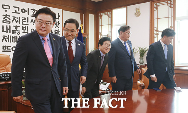 [더팩트ㅣ국회=배정한 기자] 박병석 국회의장과 여야 원내대표가 26일 오후 서울 여의도 국회 의장실에서 회동을 앞두고 기념촬영을 마친 뒤 자리에 앉고 있다. 왼쪽부터 김성원 미래통합당 원내수석부대표, 주호영 미래통합당 원내대표, 박 의장, 김태년 더불어민주당 원내대표, 김영진 더불어민주당 원내수석부대표.