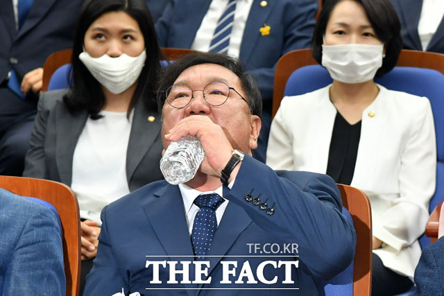 [더팩트 | 국회=남윤호 기자] 김태년 더불어민주당 원내대표(가운데)가 29일 오후 서울 여의도 국회에서 열린 의원총회에 참석해 발언을 마친 뒤 물을 마시고 있다.