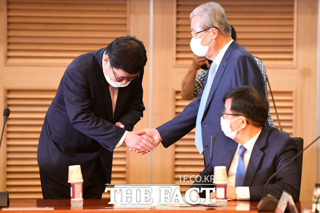 [더팩트 | 국회=남윤호 기자] 김종인 미래통합당 비상대책위원장(오른쪽)이 7일 오전 서울 여의도 국회 의원회관에서 윤창현 의원(왼쪽)이 주최한 '독점적 금융감독체계의 문제점과 개편 방향' 세미나에 참석해 윤 의원과 악수하고 있다.ilty012@tf.co.kr사진영상기획부 photo@tf.co.kr