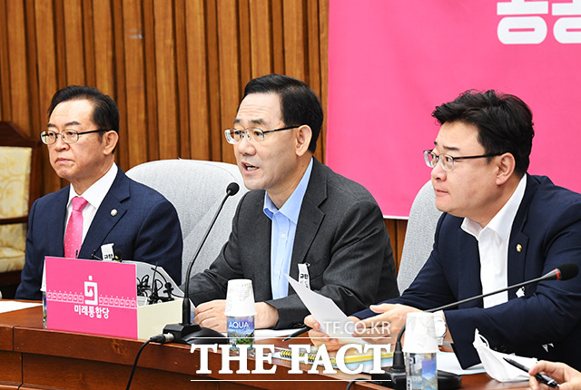 [더팩트ㅣ국회=배정한 기자] 주호영 미래통합당 원내대표(가운데)가 7일 오전 서울 여의도 국회에서 열린 미래통합당 원내대책회의에 참석해 모두발언을 하고 있다.