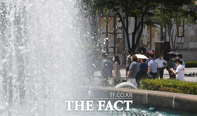 [더팩트ㅣ이동률 기자] 서울 낮 기온이 32도까지 올라 무더운 날씨를 보인 9일 오후 서울 중구 한국은행 분수대에서 시원한 물줄기가 솟구치고 있다.
