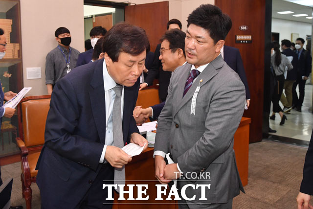 [더팩트 | 국회=남윤호 기자] 도종환 국회 문화체육관광위원장(왼쪽)이 14일 오전 서울 여의도 국회에서 열린 전체회의를 마치고 이용 미래통합당 의원과 대화를 나누고 있다.