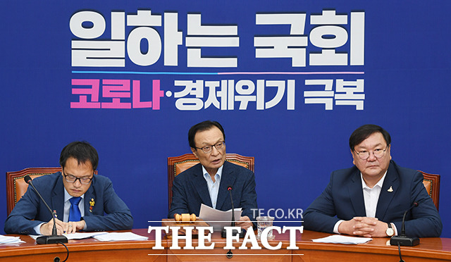 [더팩트ㅣ국회=배정한 기자] 이해찬 더불어민주당 대표(가운데)가 15일 오전 서울 여의도 국회에서 열린 더불어민주당 최고위원회의에 참석해 모두발언을 하고 있다.