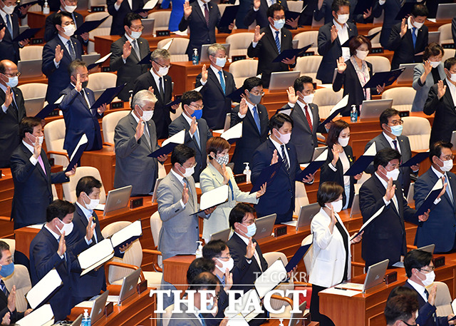 [더팩트ㅣ국회=배정한 기자] 제21대 국회의원들이 16일 오후 서울 여의도 국회에서 열린 제21대 국회 개원식에서 국회의원 선서를 하고 있다. hany@tf.co.kr 사진영상기획부 photo@tf.co.kr