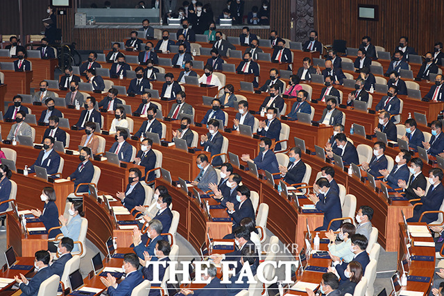 [더팩트ㅣ국회=배정한 기자] 문재인 대통령이 16일 오후 국회 본회의장에서 열린 제21대 국회 개원식에서 개원 연설을 하는 가운데 미래통합당 의원들(위쪽)은 검은색 마스크를 착용, 더불어민주당 의원들은 하얀색 마스크를 착용하고 있다. hany@tf.co.kr 사진영상기획부 photo@tf.co.kr