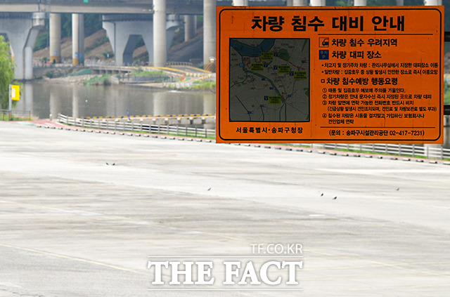 [더팩트|이선화 기자] 수도권 및 중부 지방을 중심으로 폭우가 예보된 19일 오후 서울 송파구 탄천주차장이 텅 비어있다.