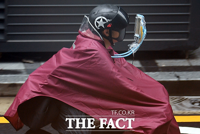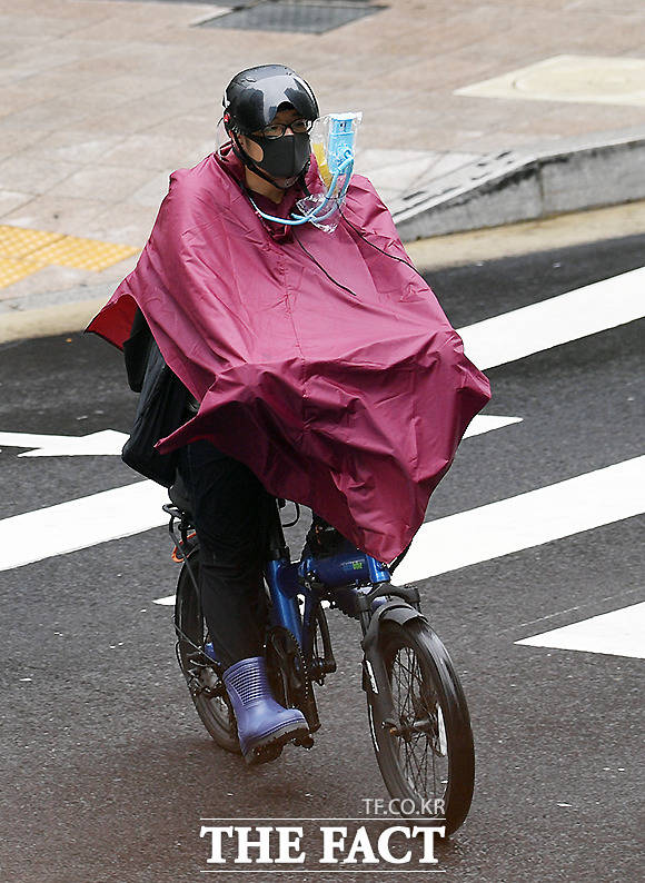 [더팩트ㅣ이새롬 기자] 전국이 종일 흐리고 비가 내리는 날씨가 계속되는 23일 오전 서울 시청 일대에서 한 시민이 비옷으로 무장한 채 자전거를 타고 이동하고 있다.