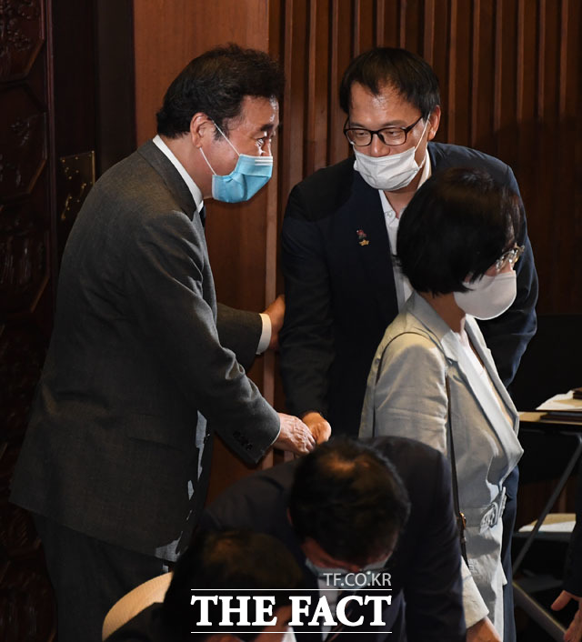 [더팩트 | 국회=남윤호 기자] 23일 오후 서울 여의도 국회에서 열린 본회의에서 더불어민주당 당권 주자인 이낙연 의원(왼쪽)과 박주민 의원이 악수를 하고 있다.