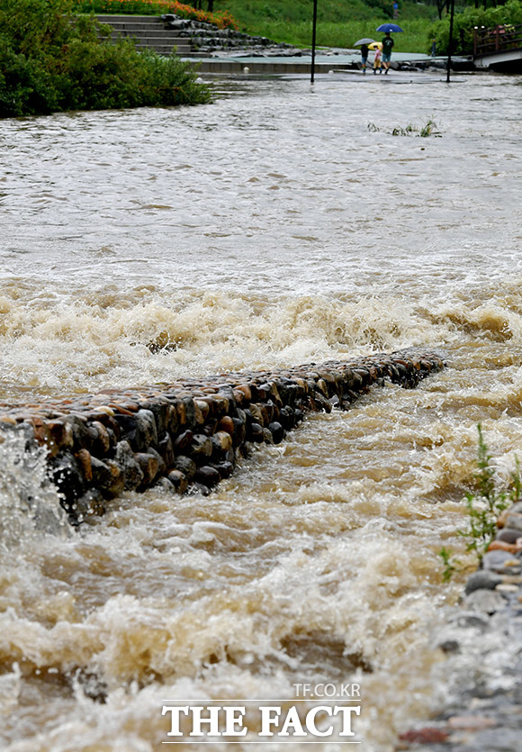 [더팩트ㅣ이덕인 기자] 중북부 지역을 중심으로 집중호우가 쏟아진 1일 오후 서울 서초구 양재천의 강물이 불어 거친 물줄기를 보이고 있다.
