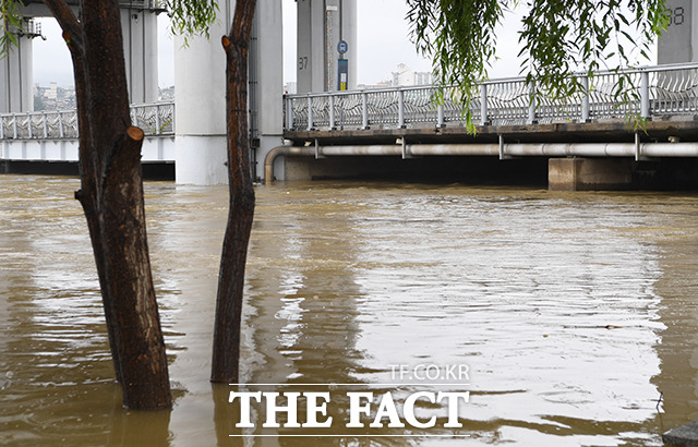 [더팩트ㅣ배정한 기자] 경기도 등 중부지방 곳곳에 호우주의보가 내려진 2일 오전 서울 서초구 잠수교의 수위가 보행자 통제 수준을 위협하고 있다.