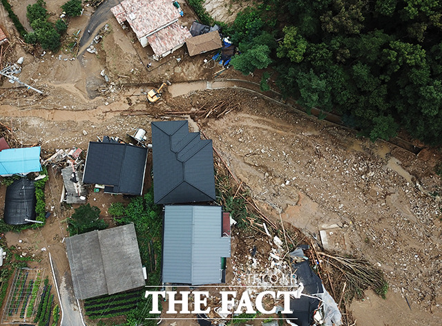 [더팩트ㅣ안성=배정한 기자] 경기남부지역에 시간당 100mm가 넘는 폭우가 쏟아지는 등 집중호우가 이어지는 2일 산사태가 발생한 안성시 죽산면 장원리의 주택가에서 복구작업이 진행되고 있다.