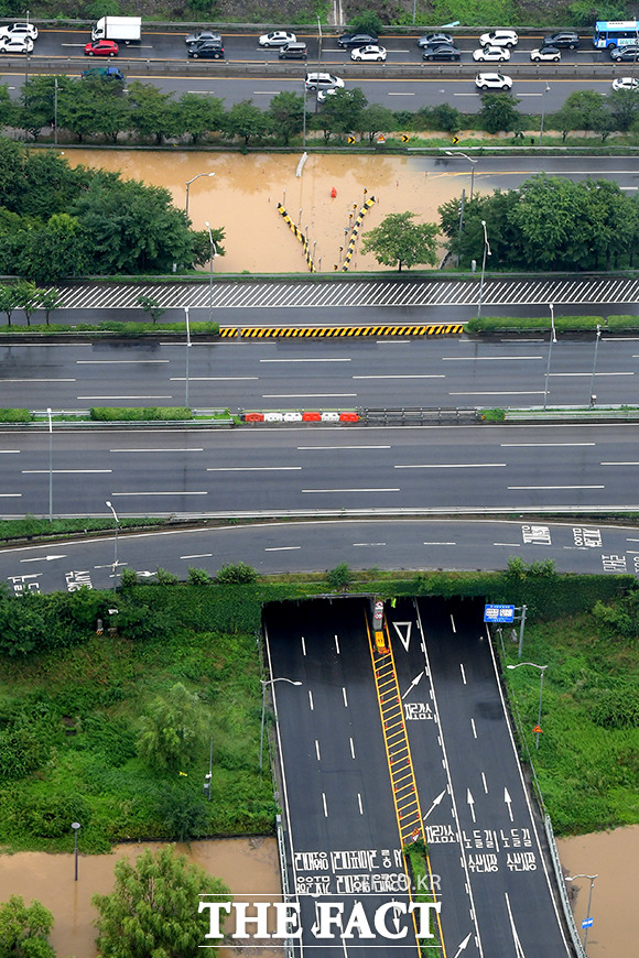 기상청에 따르면 이날 중부지방을 중심으로 돌풍과 천둥·번개를 동반한 시간당 50~80㎜의 강한 비가 내릴 것으로 예보됐다. 이에 따라 한강 수위가 올라가면서 올림픽대로 염창IC에서 동작대교까지 양방향 모두 통제됐다.