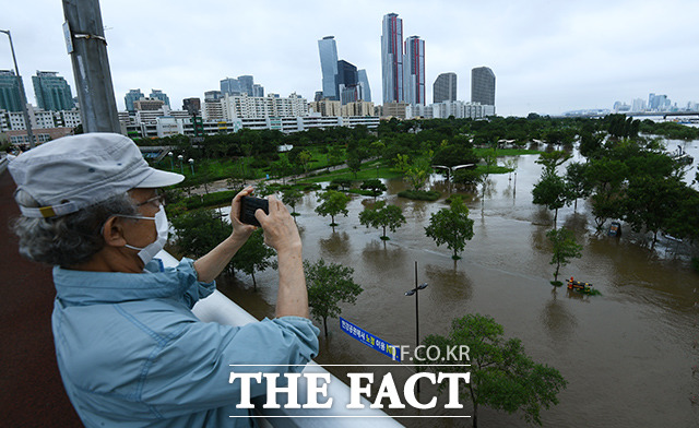 [더팩트ㅣ이동률 기자] 한강 본류에 홍수주의보가 9년 만에 발령된 6일 오후 서울 영등포구 원효대교에서 한 시민이 침수된 여의도한강공원을 바라보고 있다.