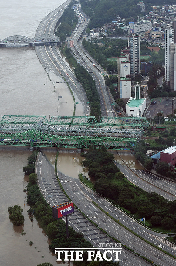 [더팩트ㅣ이동률 기자] 한강 본류에 홍수주의보가 9년 만에 발령된 6일 오후 서울 영등포구 63빌딩 전망대에서 바라본 올림픽대로 일부가 강물에 잠겨있다.