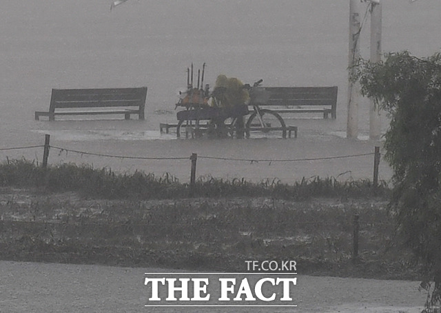 [더팩트ㅣ배정한 기자] 제5호 태풍 '장미'가 한반도에 상륙한 10일 오후 서울 강서구 염창IC 인근 안양천에서 한 시민이 폭우를 맞으며 휴식을 취하고 있다.