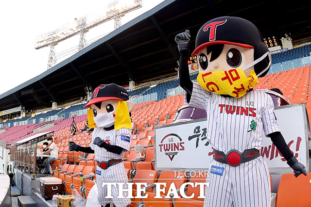 [더팩트|이선화 기자] 18일 오후 서울 송파구 잠실야구장에서 2020 KBO리그 LG 트윈스와 KIA 타이거즈의 경기가 열린 가운데 마스크를 쓴 LG 마스코트가 텅 빈 관중석에서 선수들을 응원하고 있다.