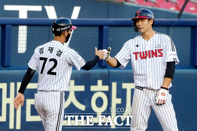 [더팩트|이선화 기자] 18일 오후 서울 송파구 잠실야구장에서 2020 KBO리그 LG 트윈스와 KIA 타이거즈의 경기가 열린 가운데 LG 홍창기가 3루 베이스를 밟은 후 김재걸 코치와 주먹을 맞대고 있다.