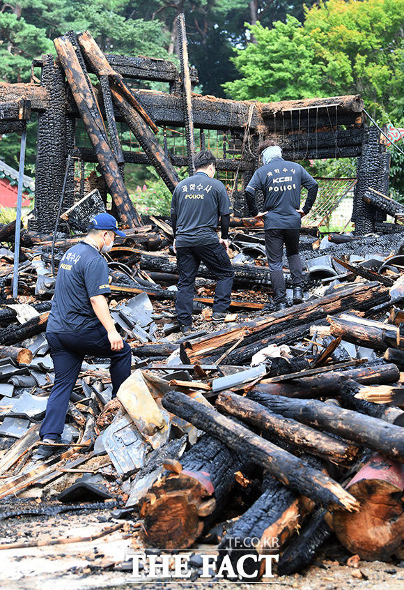 [더팩트ㅣ화성=임영무 기자] 경기도 화성 용주사 호성전에서 화재가 발생한 가운데 20일 오전 경찰 과학수사대가 현장감식을 벌이고 있다.화재는 20일 오전 1시 10분께 용주사 호성전에서 발생해 20여분 만에 꺼졌다.이 화재로 호성전(45.15㎡)이 전소됐다. 인명 피해는 없는 것으로 파악됐다.