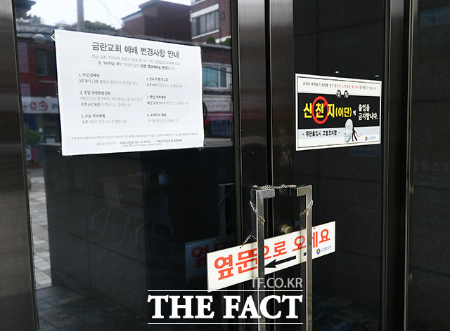 [더팩트|이동률 기자] 20일 오전 교인 중 코로나19 확진자가 나온 서울 중랑구 금란교회의 문이 굳게 닫혀 있다.