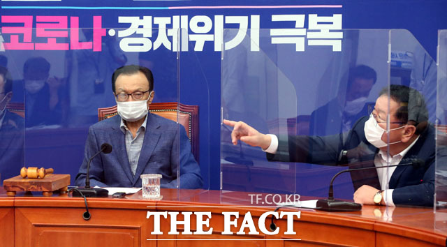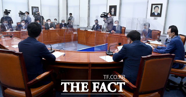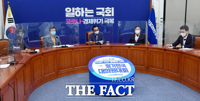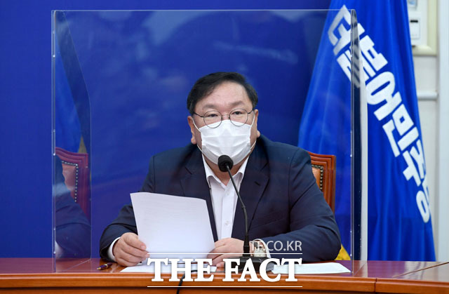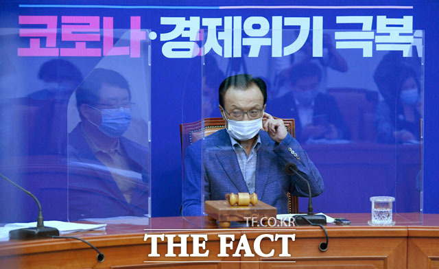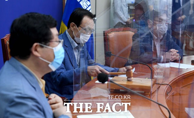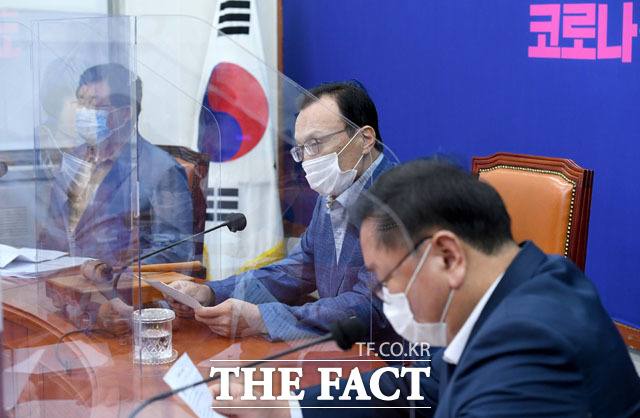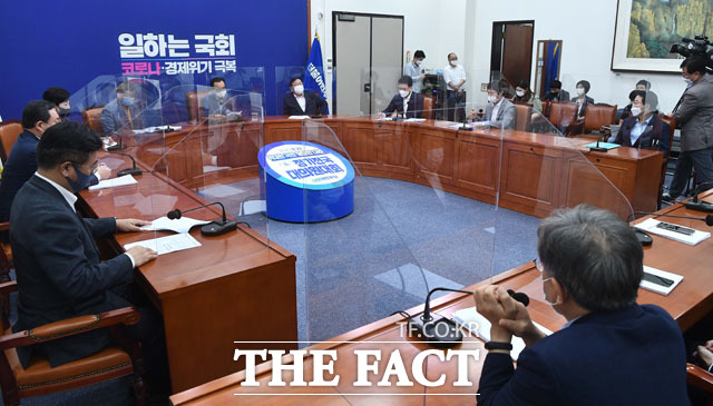 [더팩트 | 국회=남윤호 기자] 김태년 더불어민주당 원내대표(가운데)가 21일 오전 서울 여의도 국회에서 열린 최고위원회의에 참석해 발언하고 있다. 더불어민주당은 회의실 내 코로나19 감염을 우려해 차단용 칸막이를 설치한 상태로 회의를 진행했다.