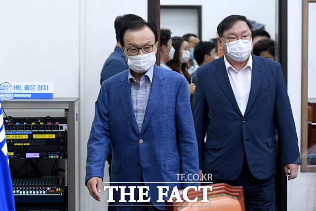 김태년 더불어민주당 원내대표(가운데)가 21일 오전 서울 여의도 국회에서 열린 최고위원회의에 참석해 발언하고 있다. 왼쪽은 이해찬 대표. /국회=남윤호 기자