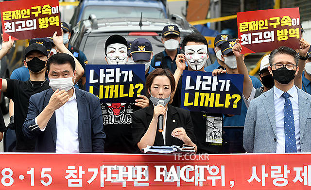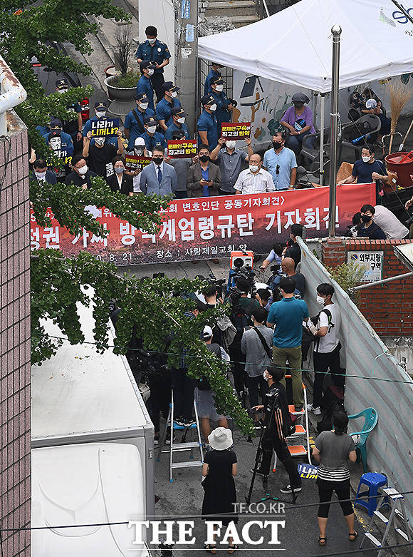 [더팩트ㅣ이새롬 기자] 사랑제일교회 등을 중심으로 수도권의 코로나19(신종 코로나바이러스 감염증) 확산세가 이어지는 21일 서울 성북구 사랑제일교회 앞에서 전광훈 사랑제일교회 목사의 변호인단이 기자회견을 열고 전 목사의 성명서를 대독하고 있다.
