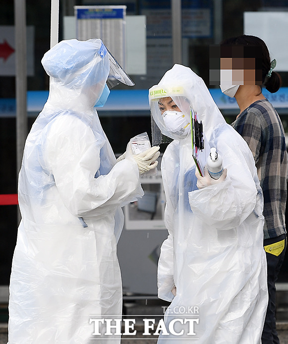 [TF포토] 방호복에 우비까지...'소나기에도 분주한 의료진'