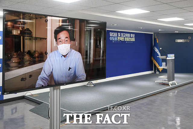 [더팩트ㅣ이동률 기자] 22일 오후 서울 여의도 더불어민주당 중앙당사에서 열린 당대표 및 최고위원 후보 수도권 온택트 합동연설회에서 당대표 후보인 이낙연, 김부겸, 박주민 후보(왼쪽부터)가 영상연설을 하고 있다.