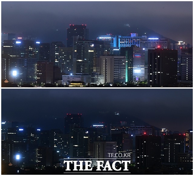 [더팩트ㅣ이동률 기자] '제17회 에너지의 날'인 22일 오후 서울 종로구 부암동에서 바라본 서울 도심이 조명을 밝힌 모습(위)과 오후 9시부터 5분간 소등 한 모습이 대조를 보이고 있다.