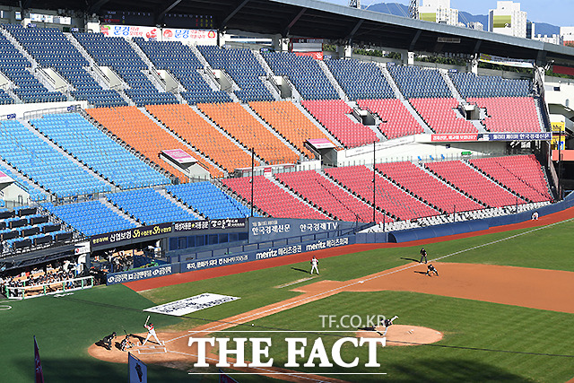 [더팩트ㅣ이새롬 기자] 코로나19 (신종 코로나바이러스 감염증) 확산으로 정부가 사회적거리두기 2단계를 전국으로 확대 적용한 23일 서울 송파구 잠실야구장에서 2020 KBO리그 LG 트윈스와 한화 이글스의 경기가 무관중으로 열리고 있다.