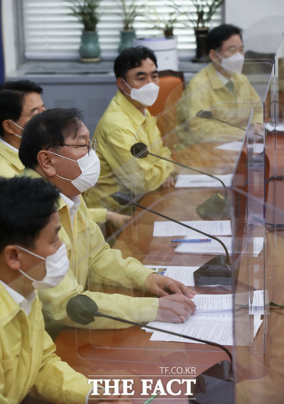 [더팩트ㅣ국회=배정한 기자] 김태년 더불어민주당 원내대표(왼쪽 두번째)가 25일 오전 서울 여의도 국회에서 열린 원내대책회의에 참석해 모두발언을 하고 있다.
