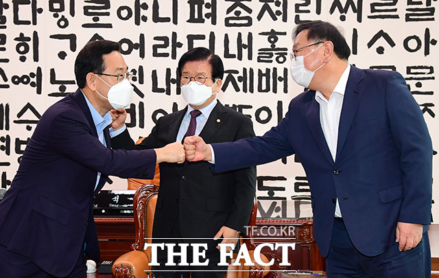 [더팩트ㅣ국회=배정한 기자] 박병석 국회의장과 여야 원내대표가 26일 국회에서 정례회동을 갖기에 앞서 주먹을 맞대며 인사를 나누고 있다. 왼쪽부터 주호영 미래통합당 원내대표, 박의장,김태년 더불어민주당 원내대표. hany@tf.co.kr 사진영상기획부 photo@tf.co.kr