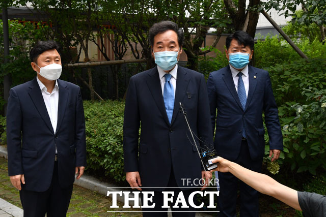 [더팩트 | 남윤호 기자] 자가격리를 마친 이낙연 더불어민주당 신임 당대표(가운데)가 31일 오전 서울 종로구 자택을 나서며 취재진의 질의에 답하고 있다.