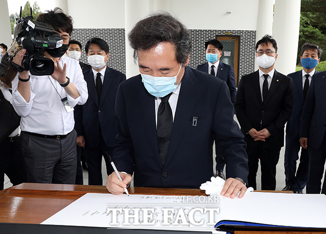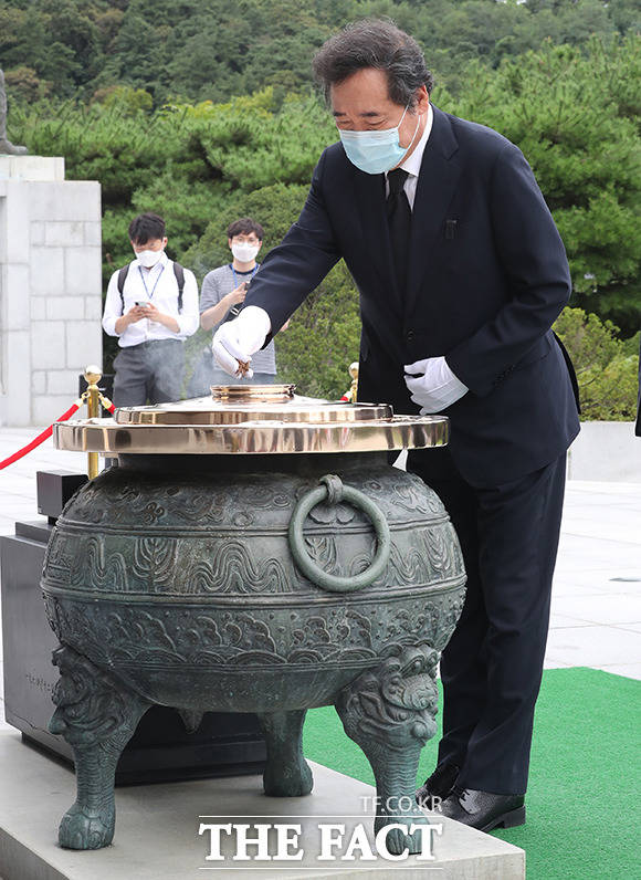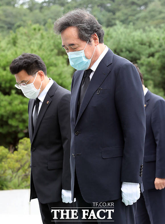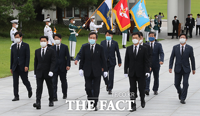 이낙연 더불어민주당 대표가 31일 오후 서울 동작구 국립현충원을 방문해 현충탑에서 참배를 하고 있다. 민주당 당 대표로 선출된 뒤 첫 일정으로 국립현중원을 참배한 이낙연 대표는 호국영령들에게 코로나19로 고통을 받고 있는 국민들이 국난을 극복할 수 있도록 해달라고 방명록에 서명했다.