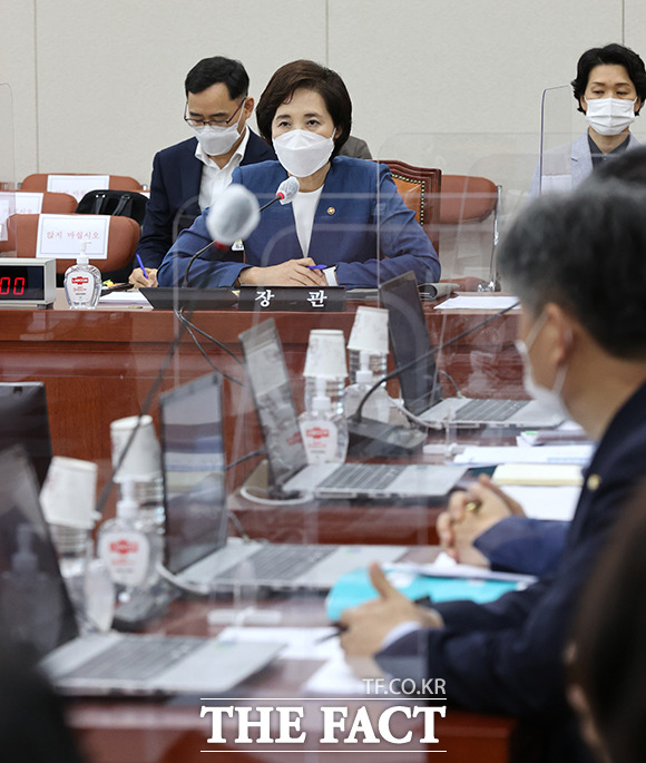 [더팩트ㅣ국회=배정한 기자] 유은혜 부총리 겸 교육부 장관이 31일 오후 서울 여의도 국회에서 열린 교육위원회 전체회의에 출석해 의원들의 질의에 답변을 하고 있다.