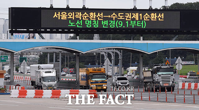 [더팩트ㅣ안산=임영무 기자] 고속국도 제100호선인 서울외곽순환고속도로 명칭이 수도권 제1순환고속도로로 변경된 1일 경기 안산시 상록구 서서울요금소 대형 전광판에는 노선 변경 안내문구가 걸려 있다.darkroom@tf.co.kr사진영상기획부 photo@tf.co.kr