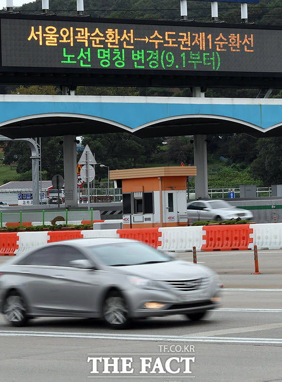 [더팩트ㅣ안산=임영무 기자] 고속국도 제100호선인 서울외곽순환고속도로 명칭이 수도권 제1순환고속도로로 변경된 1일 경기 안산시 상록구 서서울요금소 대형 전광판에는 노선 변경 안내문구가 걸려 있다. darkroom@tf.co.kr사진영상기획부 photo@tf.co.kr
