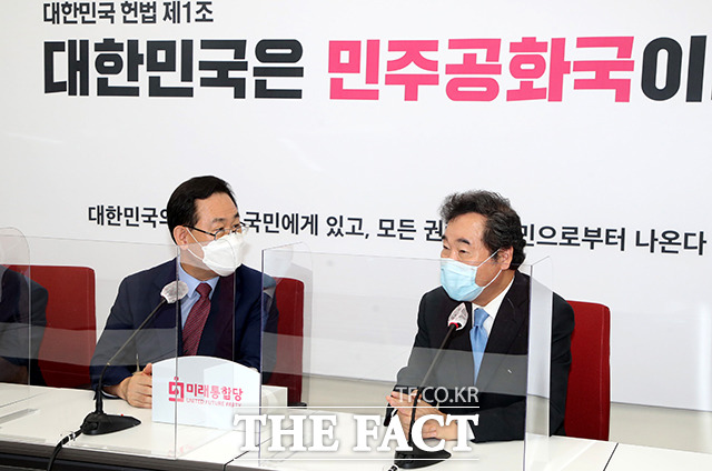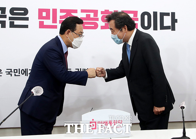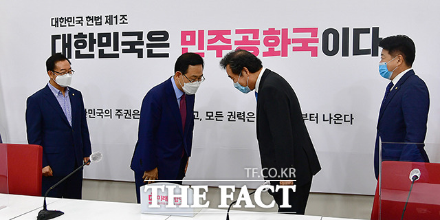 [더팩트ㅣ국회=배정한 기자] 이낙연 더불어민주당 신임 당대표가 1일 오전 서울 여의도 국회에서 주호영 미래통합당 원내대표(왼쪽)를 예방하고 있다.