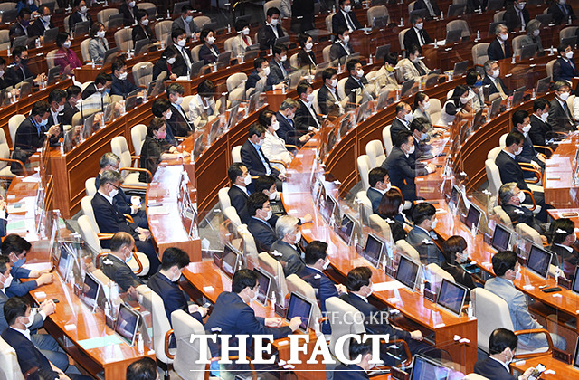[더팩트ㅣ국회=배정한 기자] 1일 오후 서울 여의도 국회에서 382회 정기국회 개원식이 열리고 있다. 이날 본회의장에는 코로나19 감염 예방을 위해 개인별 비말 차단 칸막이가 설치됐다.