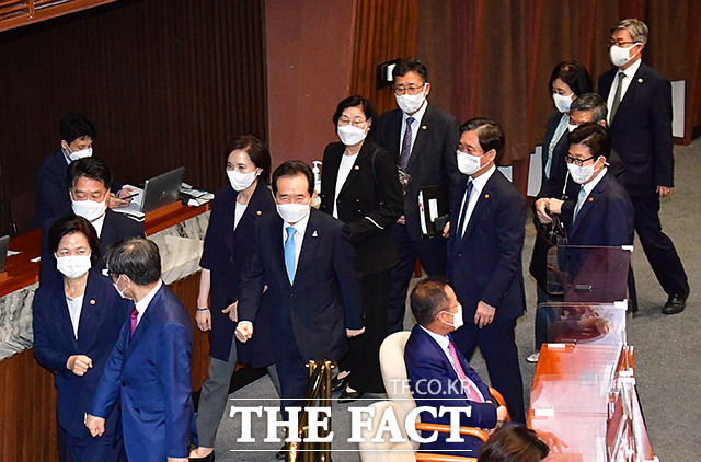 [더팩트ㅣ국회=배정한 기자] 1일 오후 서울 여의도 국회 의사당에서 열린 제382회 국회(정기회) 개회식 직후 정세균 국무총리와 국무위원들이 퇴장하고 있다. hany@tf.co.kr 사진영상기획부 photo@tf.co.kr