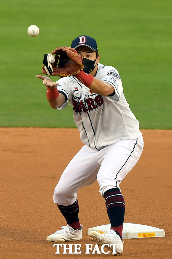 [더팩트|이선화 기자] 1일 오후 서울 송파구 잠실야구장에서 2020 KBO리그 두산 베어스와 한화 이글스의 경기가 열린 가운데 두산 최주환이 수비를 하고 있다.