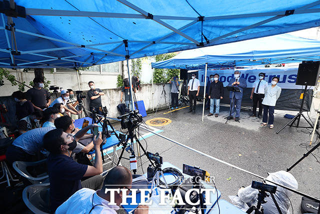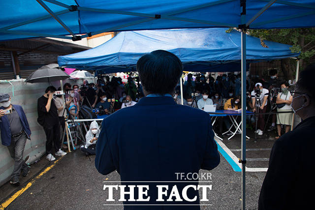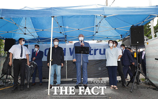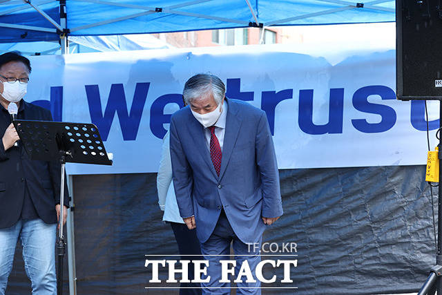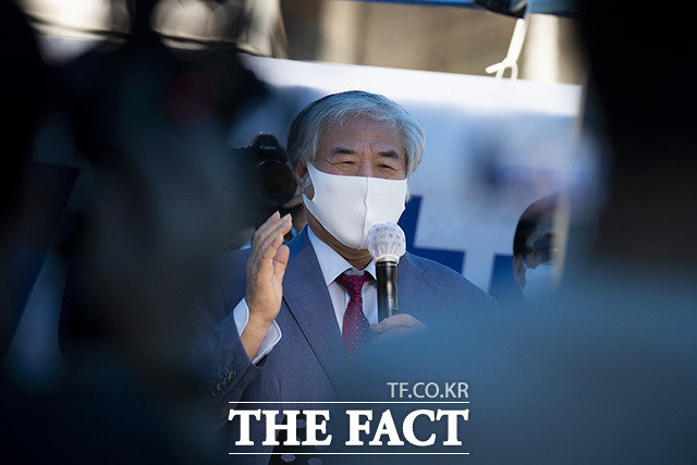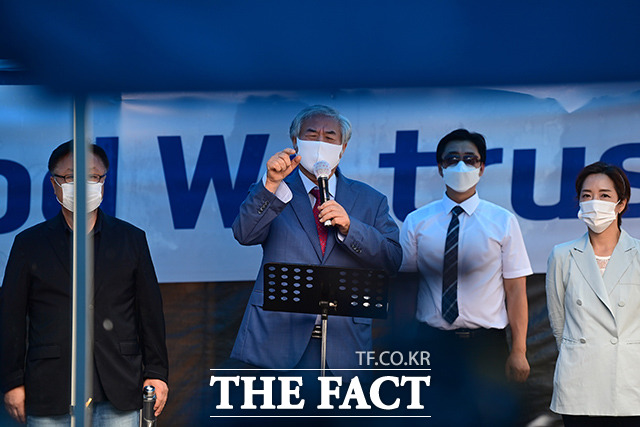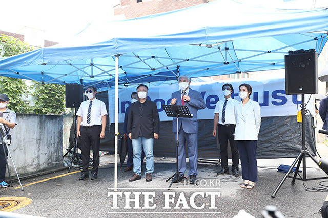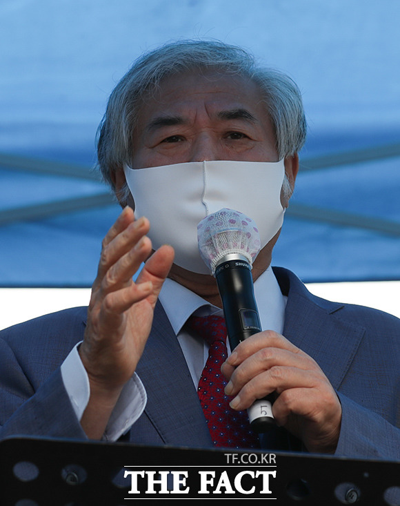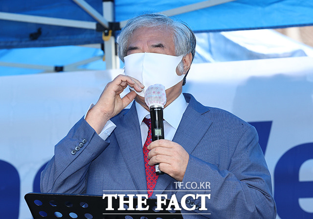 [더팩트ㅣ이동률 기자] 코로나19 치료를 받고 퇴원한 전광훈 목사가 2일 오전 서울 성북구 사랑제일교회 앞에서 기자회견을 하고 있다.