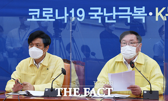 [더팩트ㅣ국회=배정한 기자] 김태년 더불어민주당 원내대표(오른쪽)가 3일 오전 서울 여의도 국회에서 열린 더불어민주당 정책조정회의에 참석해 모두발언을 하고 있다.